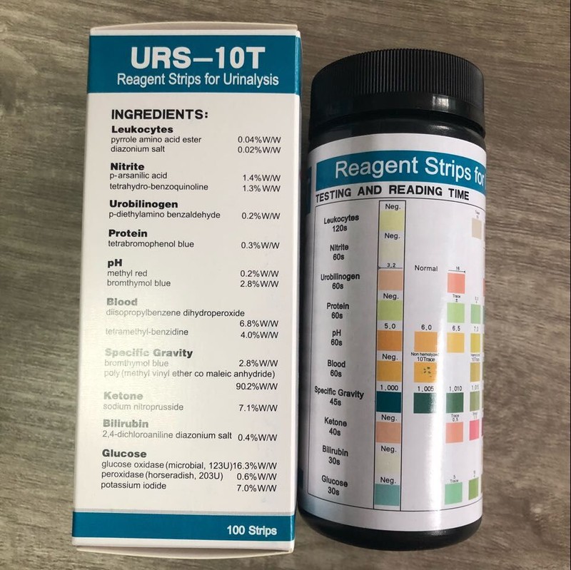 It tests Leukocytes, Nitrite, Urobilinogen, Protein, pH, Blood, Specific Gravity, Ketone, Bilirubin, Glucose.