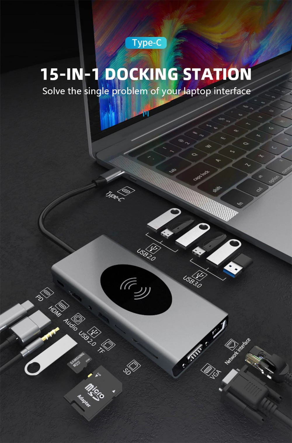 15 In 1 Docking Station Usb Hub Type C To Hdmi-Compatible Wireless Charging Usb 3.0 Adapter Type C Hub Dock Station For Macbook