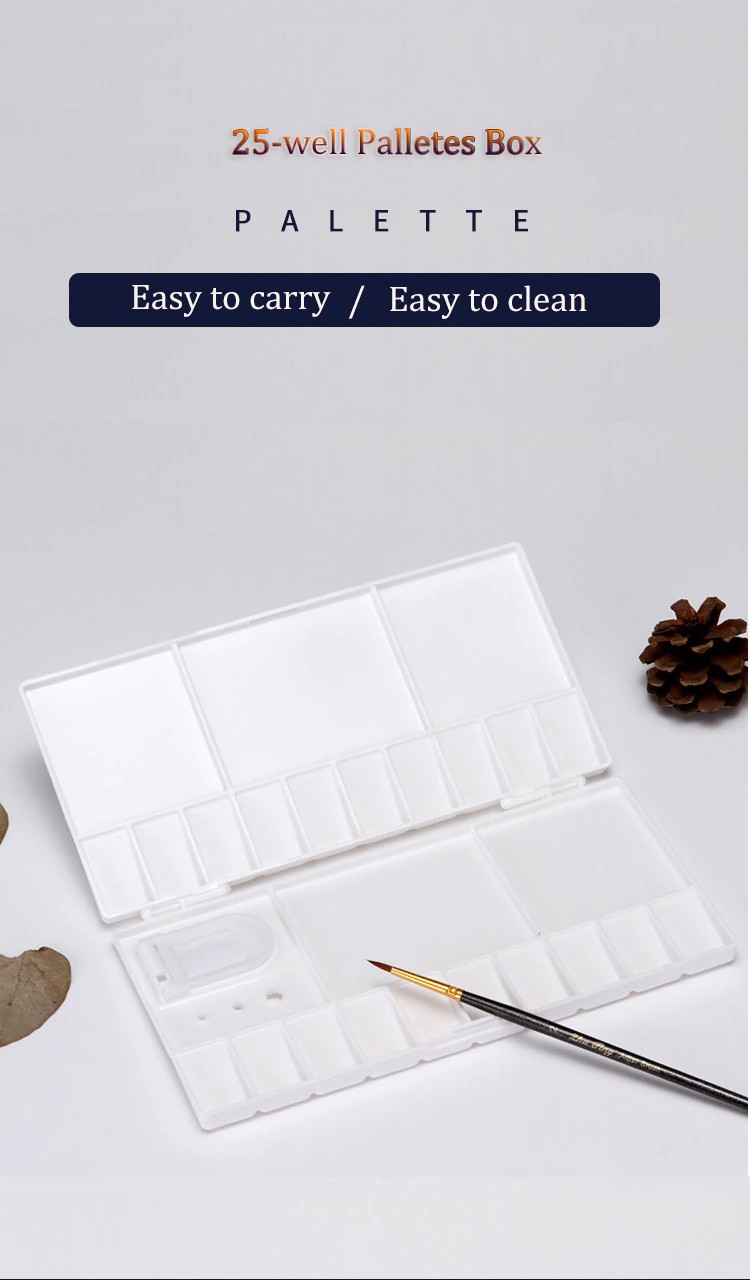 25 Compartments: 20 small wells and 5 large mixing areas in pallet, easy to mix, separate the pigments in different colors, large wells for mixing colors.
