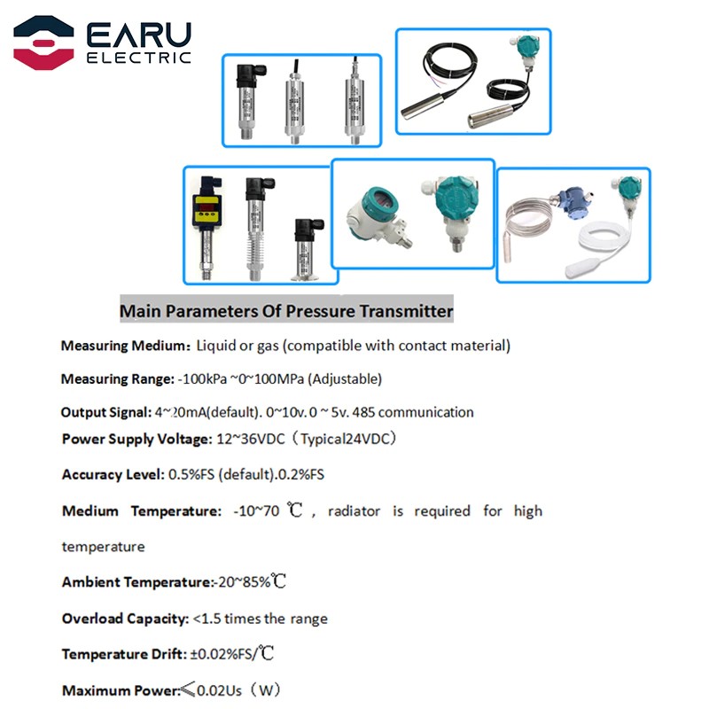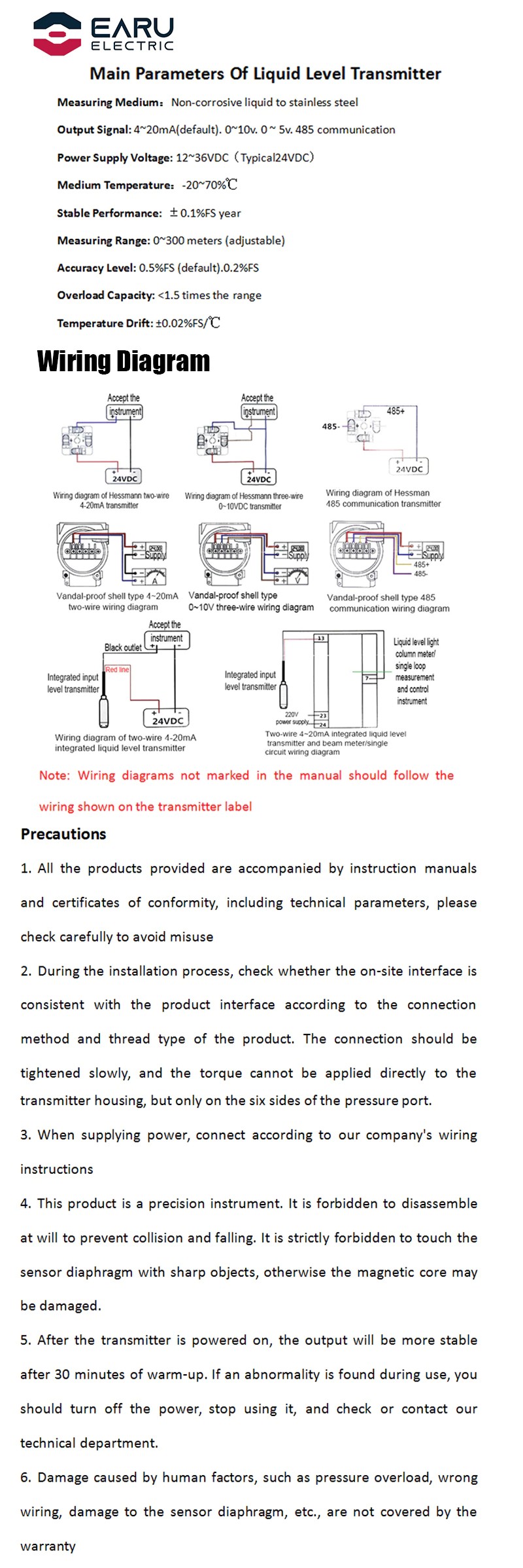 The input level/water level transmitter uses a diffusion silicon chip to encapsulate the diffusion silicone oil-filled core in a stainless steel housing. The front end protective cap functions as a protective sensor diaphragm, and also allows the liquid to smoothly contact the diaphragm. Wire and housing are sealed and connected. The vent pipe is connected to the outside in the cable. The internal structure is designed to prevent condensation. Built-in micro signal processing circuit can be used for remote transmission. It has good stability and reliability.
