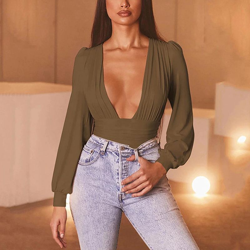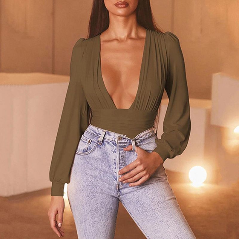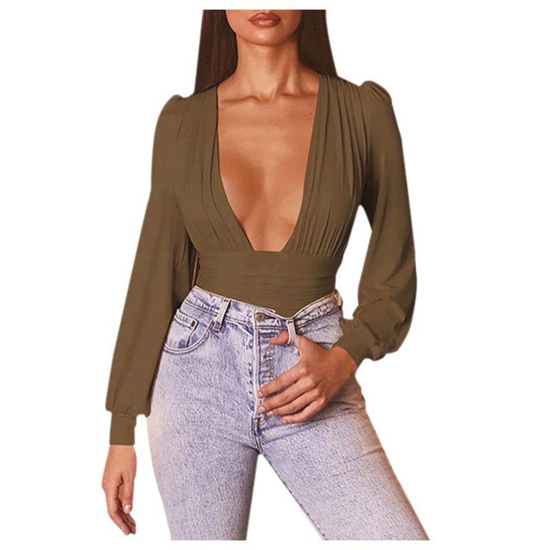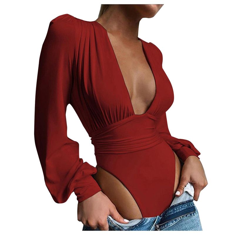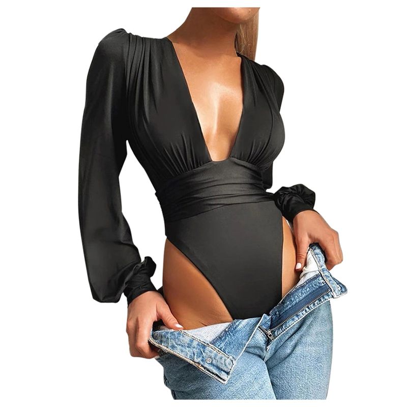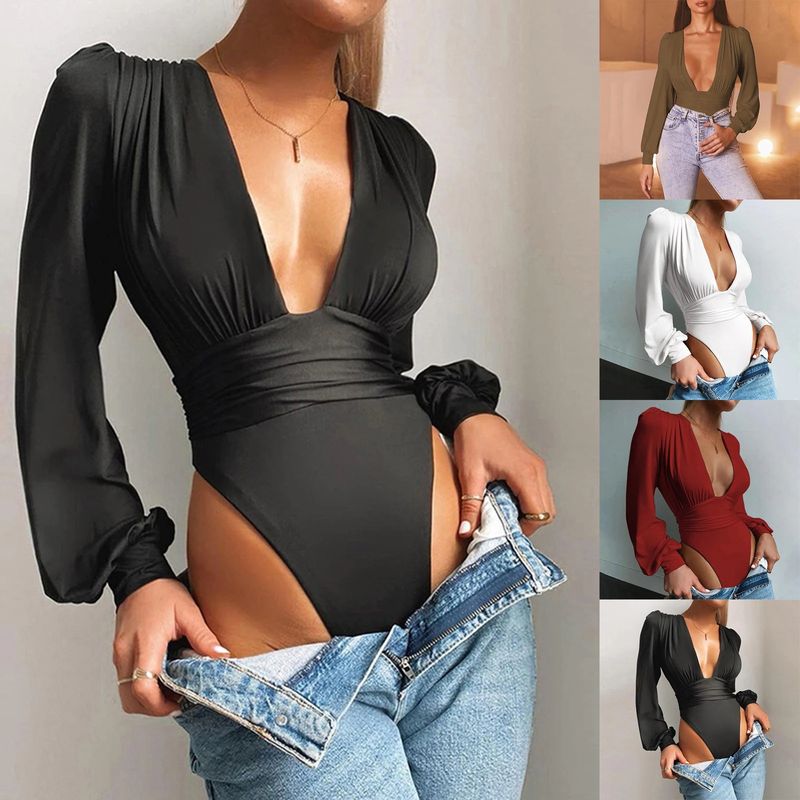 Women Sexy Low-Cut Solid Color Slim Long-Sleeved Jumpsuit Top
