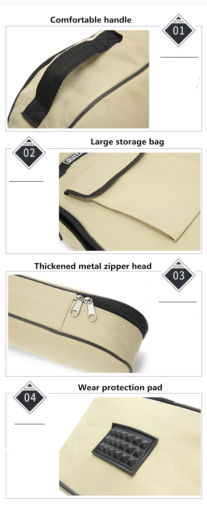 Description Features: - Waterproof material can help protect your guitar from water. - It is made of oxford fabric. - This is a great idea to keep your musical instrument safe. - Popular guitar bag, protect your guitar ,perfect design. - Double straps design, thick padded protection. Material: 600D Oxford fabri Sponge Pad: 5mm Product Size: 106cm x 42cm x 13cm Application: For 40" / 41" Acoustic guitar
