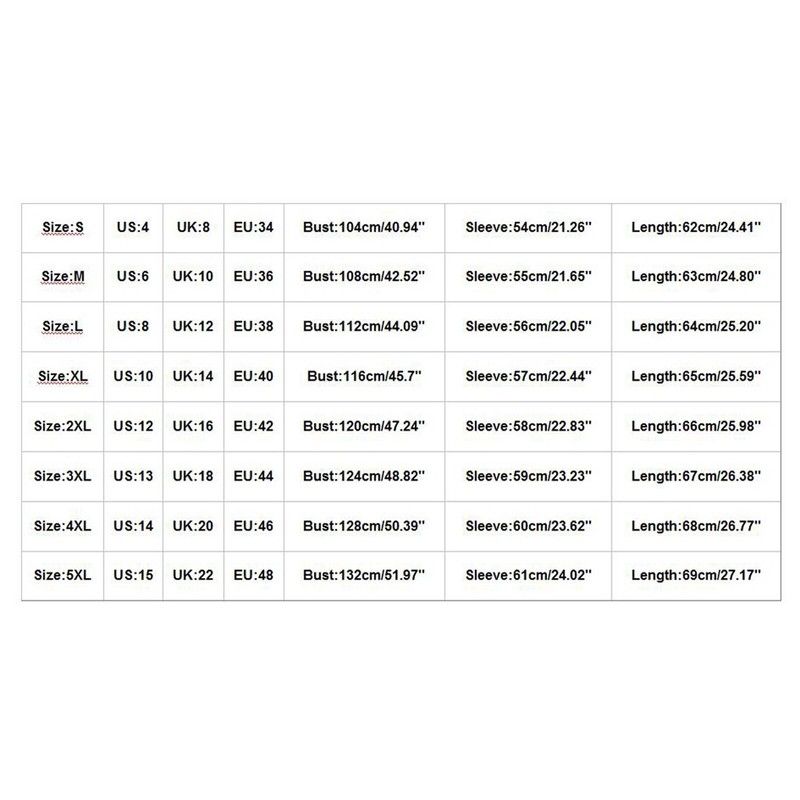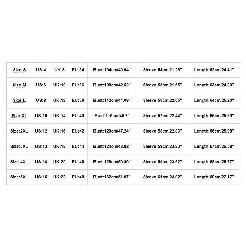 | Size | US | UK | EU | Bust | Sleeve | Length |