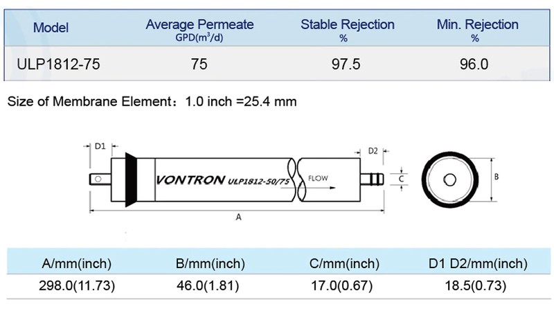 ULP1812-75 membrane can work under low pressure with 75 gpd permeate flow rate and is tested and certified by NSF/ANSI to standard 58.