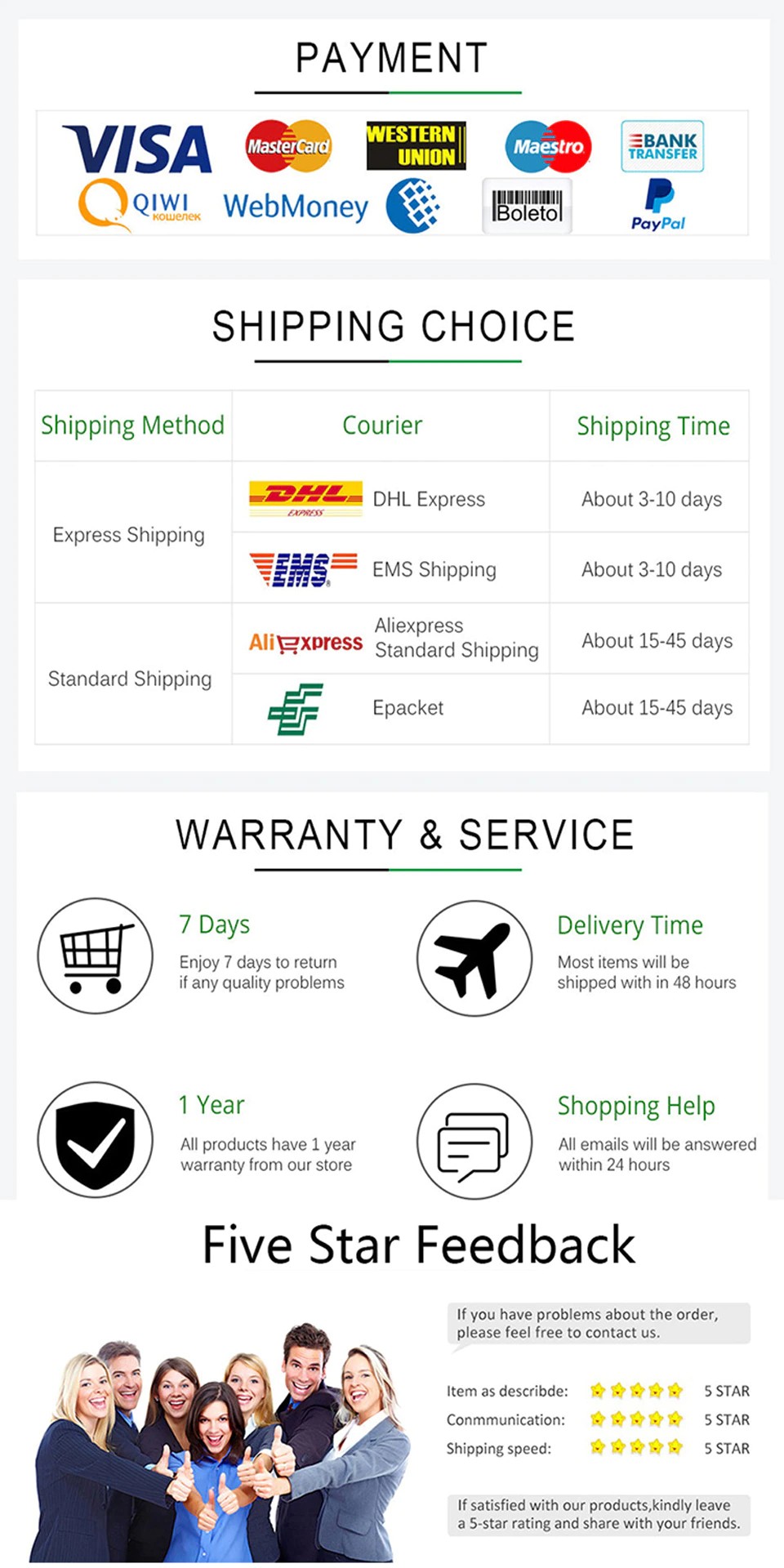 2) إذا كان لديك أي أسئلة حول الخدمة أو المنتجات ، يرجى الاتصال بنا بحرية ، وسوف نكون بصدق لإرضائك ، فمن مسؤوليتنا ، يرجى عدم ترك ردود فعل سلبية دون الاتصال بنا. شكرًا ، المراجعة السيئة والنزاع لا يمكن أن يحلان شيئًا.