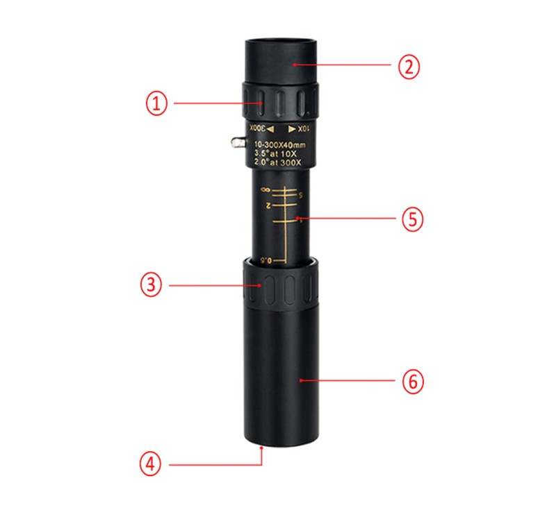 2. تطابق المسافة الموضوعية للكائن مع تحويل حلقة ضبط التركيز من ③ عن طريق الاستفادة من مقياس عرض المسافة من ⑤. يرجى تحويل التركيز ضبط حلقة من ③ اليسار واليمين وإصلاح التركيز بحيث يمكن رؤية الكائن من خلال العين بوضوح.