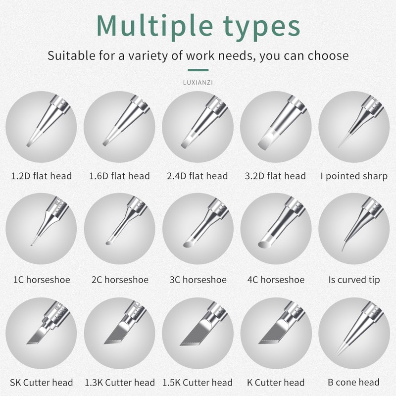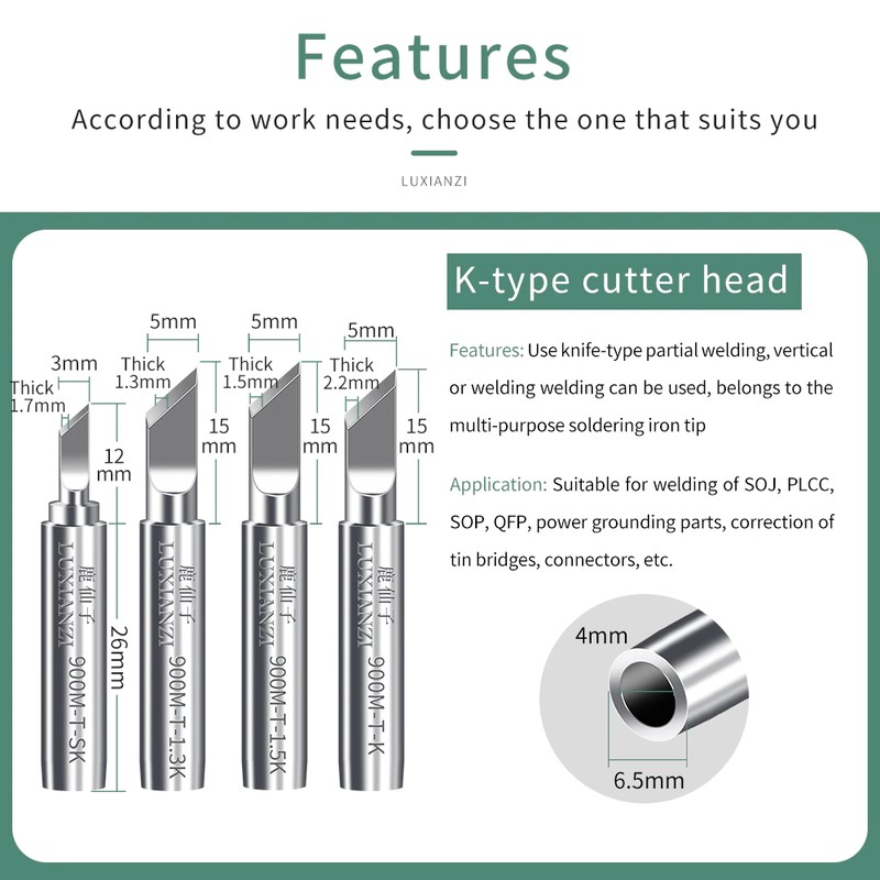 K سلسلة نوع: استخدام سكين من نوع لحام جزئي ، عمودي أو لحام لحام يمكن استخدامها ، ينتمي إلى طرف سبيكة لحام متعددة الأغراض. مناسبة لحام سوج ، PLCC ، SOP ، QFP ، أجزاء التأريض السلطة ، تصحيح الجسور القصدير ، موصلات ، الخ.