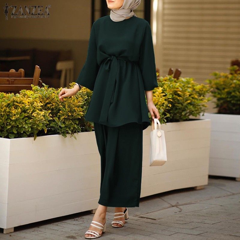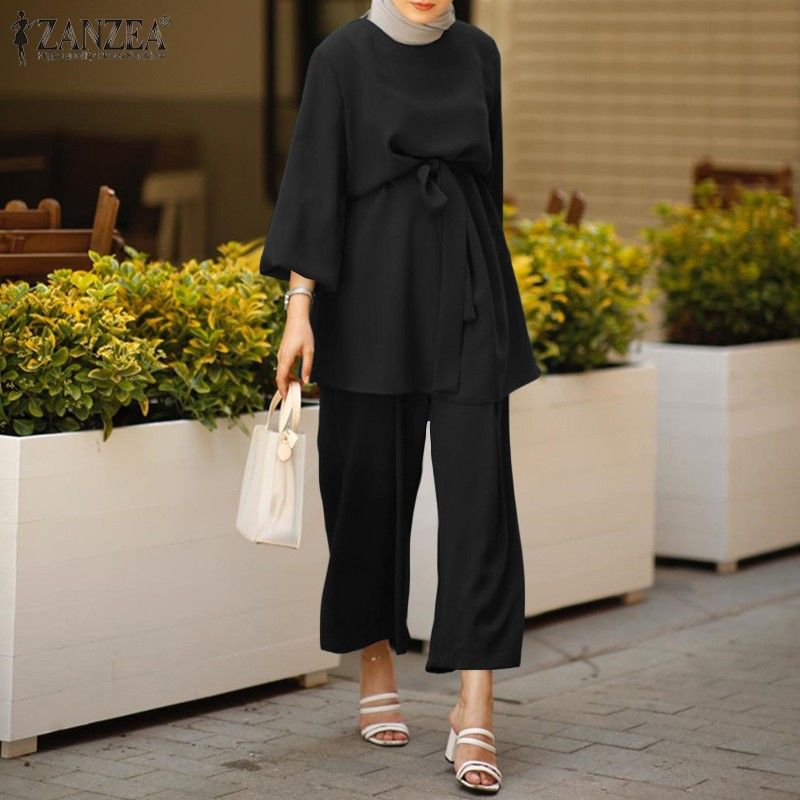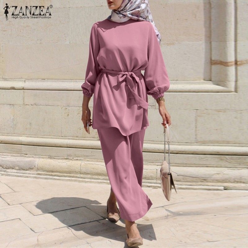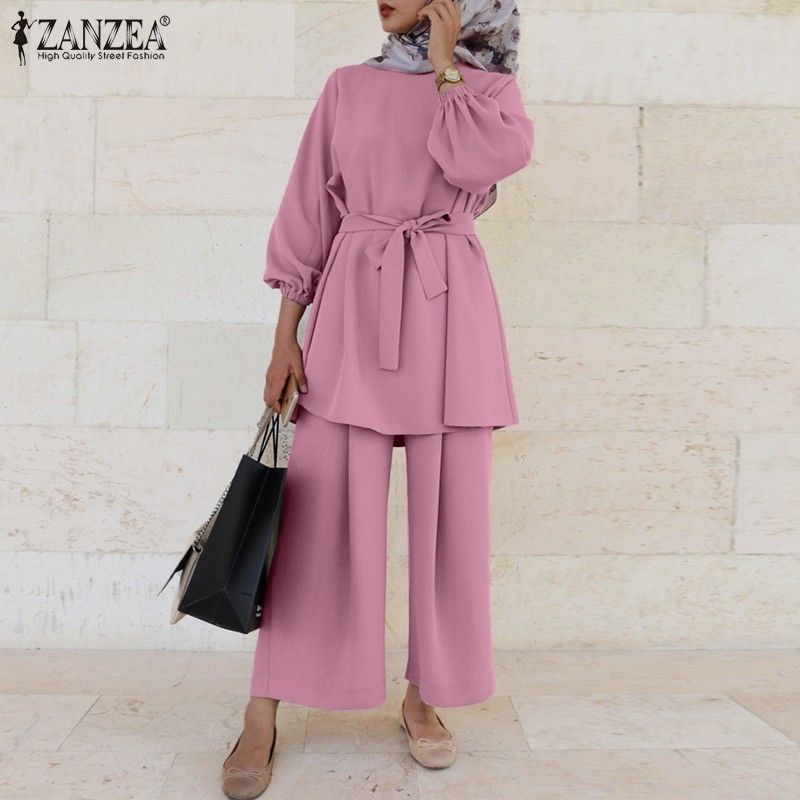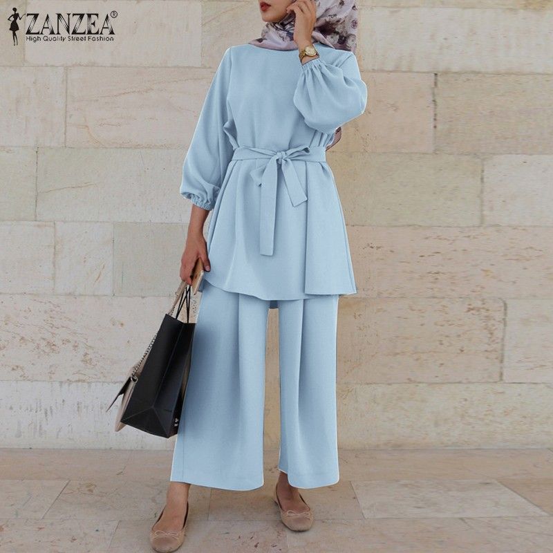 عباية تركيا ملابس مسلمة المرأة بلوزة الخريف السراويل الطويلة الأحدث Zanzea قمصان طويلة الأكمام الإناث مربوط القمصان 2 قطعة