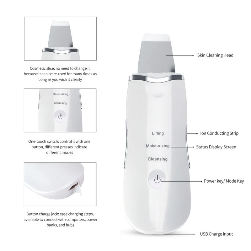 جهاز تنظيف بالموجات فوق الصوتية لبشرة الوجه يعمل على تقشير القسوة بلطف وتجديد شباب البشرة. فإنه يزيل ويزيل الخلايا الميتة بشكل فعال لتجنب التراص بشرة. عند الاستخدام لعدة أيام ، هذا منظف للوجه بالموجات فوق الصوتية يمكن أن يخفف الميلانين والأوساخ ، والتجاعيد الثابتة وتبييض الجلد ، مما يساعد على استعادة مرونة الجلد وجعل بشرتك ثابتة ، على نحو سلس وحساسة.