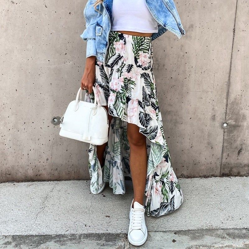 تنورة طويلة نسائية بوهيمية غير متماثلة تنورة للخريف والشاطئ منقوشة بالزهور تنورة غير رسمية بخصر عالٍ تنانير Faldas 2021