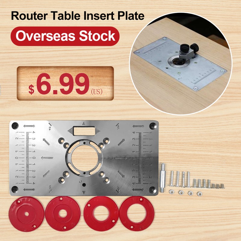 مجموعة من أدوات النجارة مقاعد البدلاء تشمل 1 راوتر الجدول إدراج لوحة ، 4 قطع راوتر إدراج خواتم وبعض مسامير التثبيت.