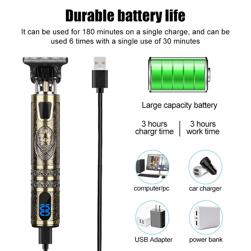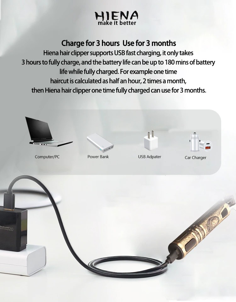 Hiena مقص الشعر يدعم USB الشحن السريع ، يستغرق فقط 3 ساعات لشحن كامل ، وعمر البطارية يمكن أن تصل إلى 180 دقيقة من عمر البطارية في حين مشحونة بالكامل. على سبيل المثال يتم حساب حلاقة مرة واحدة كما نصف ساعة ، 2 مرات في الشهر ، ثم مقص الشعر هينا مرة واحدة مشحونة بالكامل يمكن استخدامها لمدة 3 أشهر.