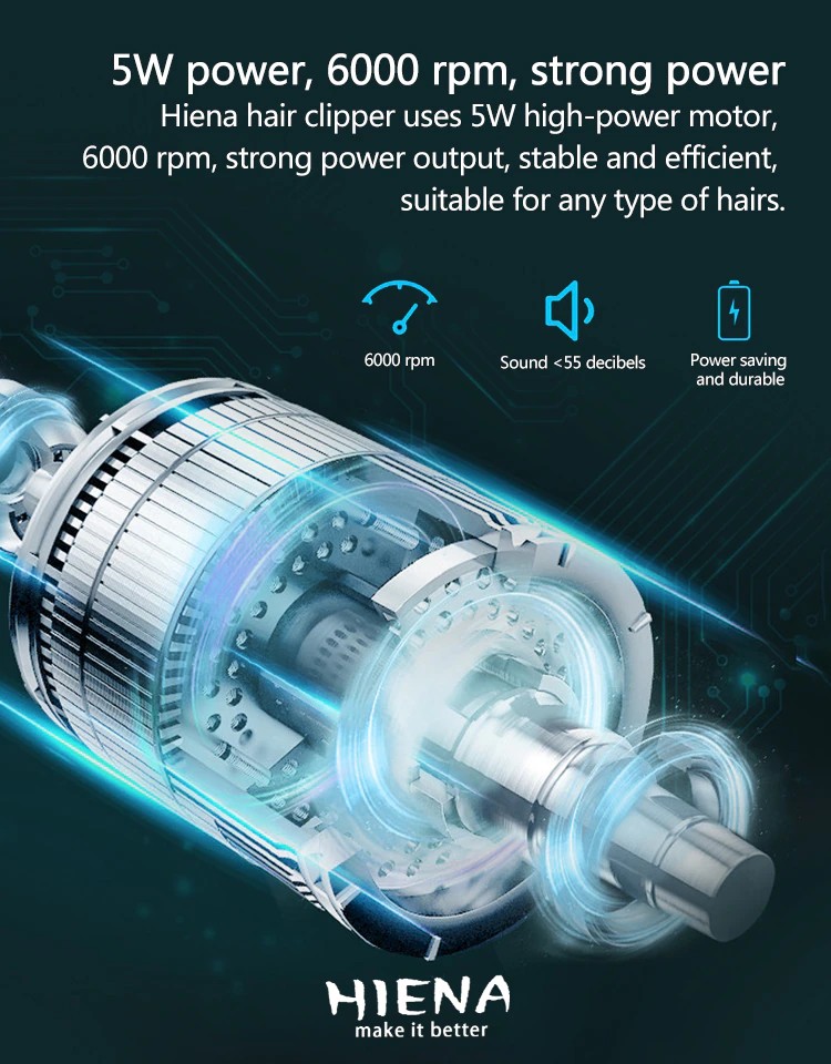 يستخدم Hiena مقص الشعر 5 واط عالية الطاقة المحرك ، 7000 دورة في الدقيقة ، خرج الطاقة قوية ومستقرة وفعالة ، ومناسبة لأي نوع من الشعر.