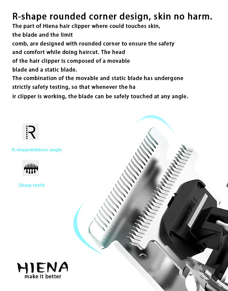 تم تصميم جزء من مقص الشعر Hiena حيث يمكن أن يلمس الجلد ، شفرة ومشط الحد ، مع ركن منحني لضمان السلامة والراحة أثناء القيام حلاقة. يتكون رأس مقص الشعر من شفرة متحركة وشفرة ثابتة. وقد خضع مزيج من شفرة المنقولة والثابتة لاختبار السلامة بدقة ، بحيث كلما كان مقص الشعر يعمل ، شفرة يمكن لمسها بأمان في أي زاوية.