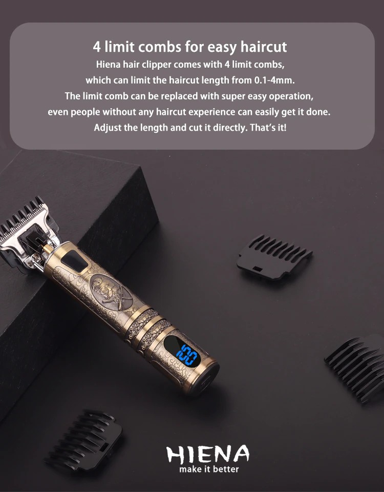 Hiena مقص الشعر يأتي مع 4 أمشاط الحد ، والتي يمكن أن تحد من طول حلاقة من 0.1-4 مللي متر. يمكن استبدال مشط الحد مع عملية سهلة للغاية ، حتى الناس دون أي تجربة حلاقة يمكن بسهولة الحصول عليه القيام به. ضبط الطول وقطع مباشرة. هذا كل شيء!