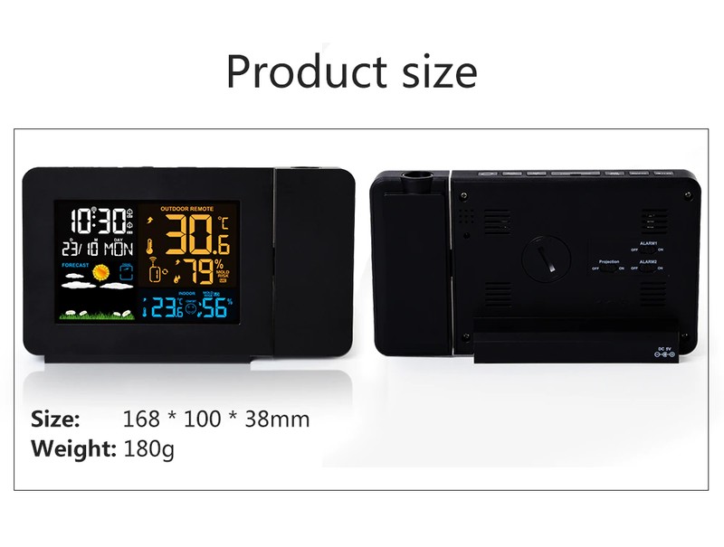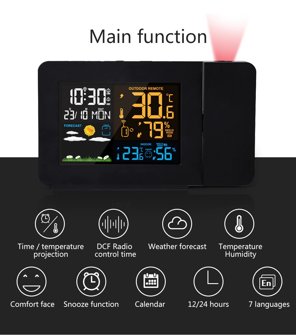 FanJu FJ3391 محطة الطقس اللون مع الإسقاط/ساعة مراقبة الطقس مع جهاز استشعار خارجي/داخلي في الهواء الطلق درجة الحرارة والرطوبة/مرحلة القمر/الساعة الذرية.