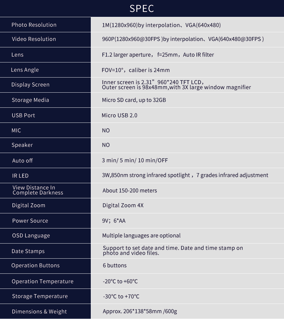 والتي تشمل 960P التقاط الصور وتسجيل الوظائف ، وتشغيل الفيديو ، وتعديل الأشعة تحت الحمراء على مستوى 7 ، تكبير بصري 3x ، وتكبير رقمي 4x.