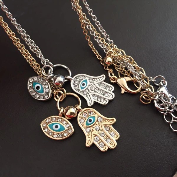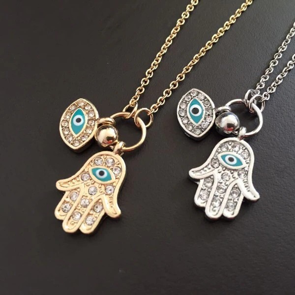 Hot البيع Vintage العربية كريستال الشر عيون و همسة اليد المعلقات قلادة ماركة الحظ فاطمة اليد الذهب سلسلة بيان قلادة