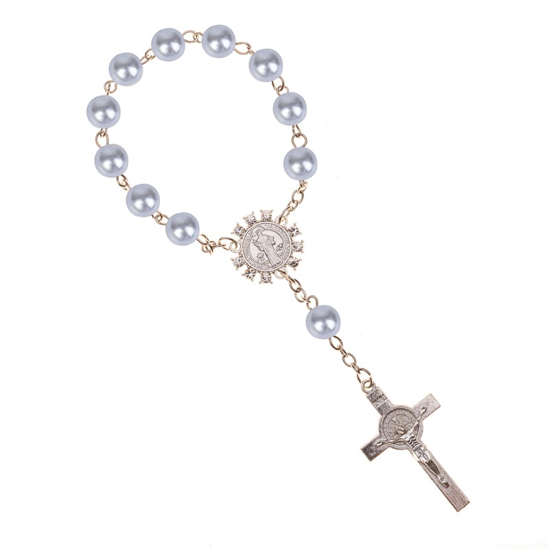 تقليد حبات اللؤلؤ مسبحة كاثوليكية الكاثوليكية المقدسة بالتواصل فضية اللون أجنحة الصليب المعلقات سوار هدية لطيفة