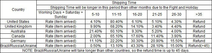 ملاحظة: البريد الجوي الصيني/الطرود ينتمي فقط إلى نظام البريد العالمي الذي هو أبطأ بكثير من التسليم الخاص. سوف تصل المنتجات في 7-25 يوم عمل إلى جميع أنحاء العالم عادة. ووقت الوصول يعتمد أيضا على بعض العوامل والمناطق المختلفة. ويرد الجدول الزمني العام للوصول أدناه لاستدعائك: