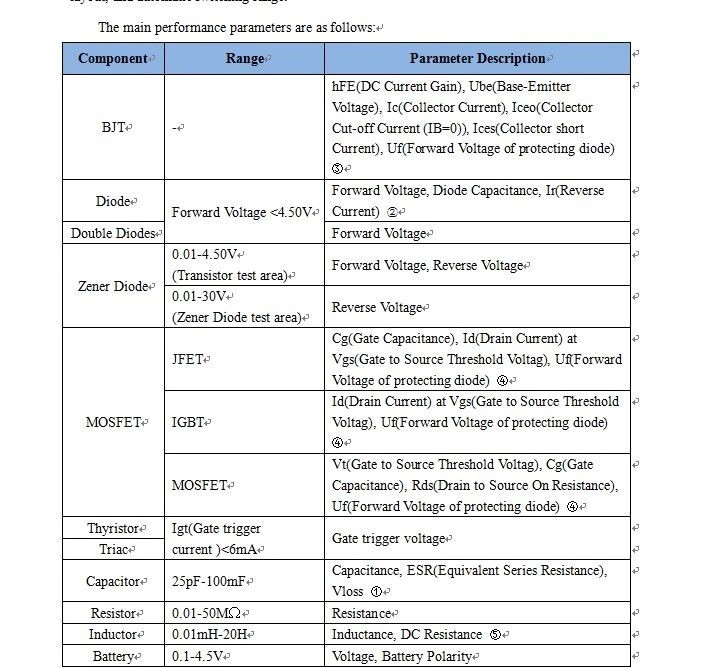 BJT | - | HFE (تيار مستمر كسب الحالي) ، Ube (قاعدة باعث الجهد) ، Ic (جامع الحالي) ، Iceo (جامع قطع التيار (IB = 0) ، ices (جامع التيار القصير) ، Uf (الجهد إلى الأمام من حماية الصمام الثنائي) ③ |