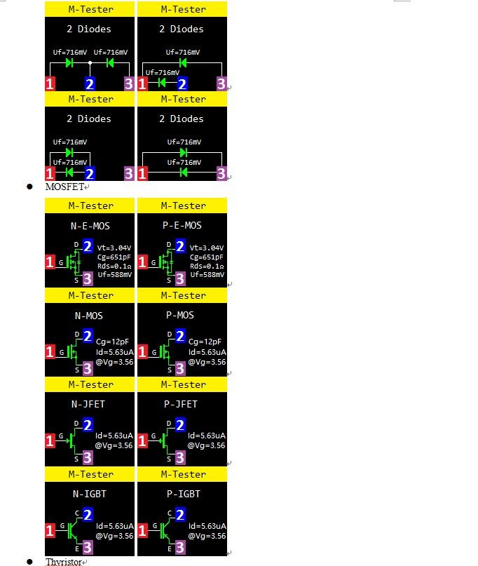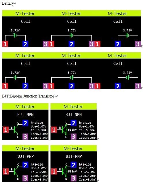 LCR-T7 / LCR-TC1: شاشة ملونة/رقاقة M644 ، وظيفتين هي نفسها! T7 أسرع قليلا! شاشة TC1 أكبر قليلاً وهي كلها مدعوم من بطاريات ليثيوم. بالإضافة إلى قياس المقاومة ، السعة ، الحث ، الثنائيات ، الترانزستورات MOS ، الثايرستور ، فإنه يمكن أيضا قياس منظمات الجهد الكهربي إضافية ، فك الأشعة تحت الحمراء (تقتصر على تنسيق هيتاشي)