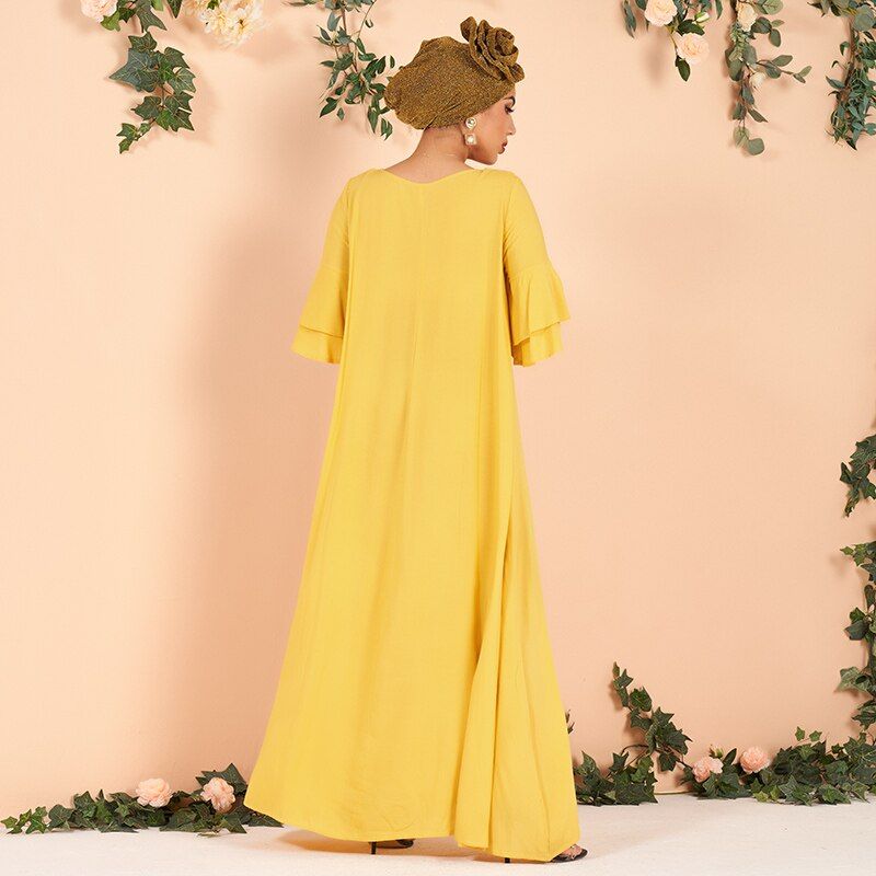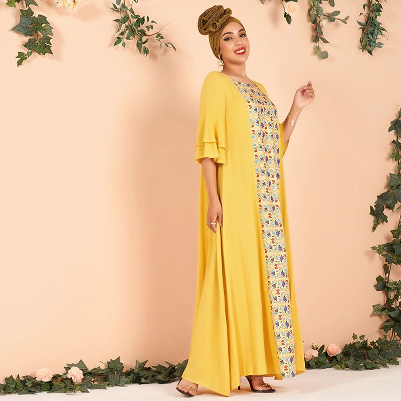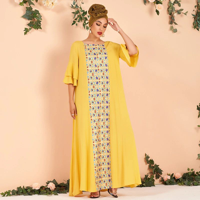 فساتين صيفية نسائية بمقاسات كبيرة ، فساتين جديدة أنيقة بنصف كم مكشكش ومزينة بنقشة الزهور ، فساتين طويلة فضفاضة باللون الأصفر للسيدات