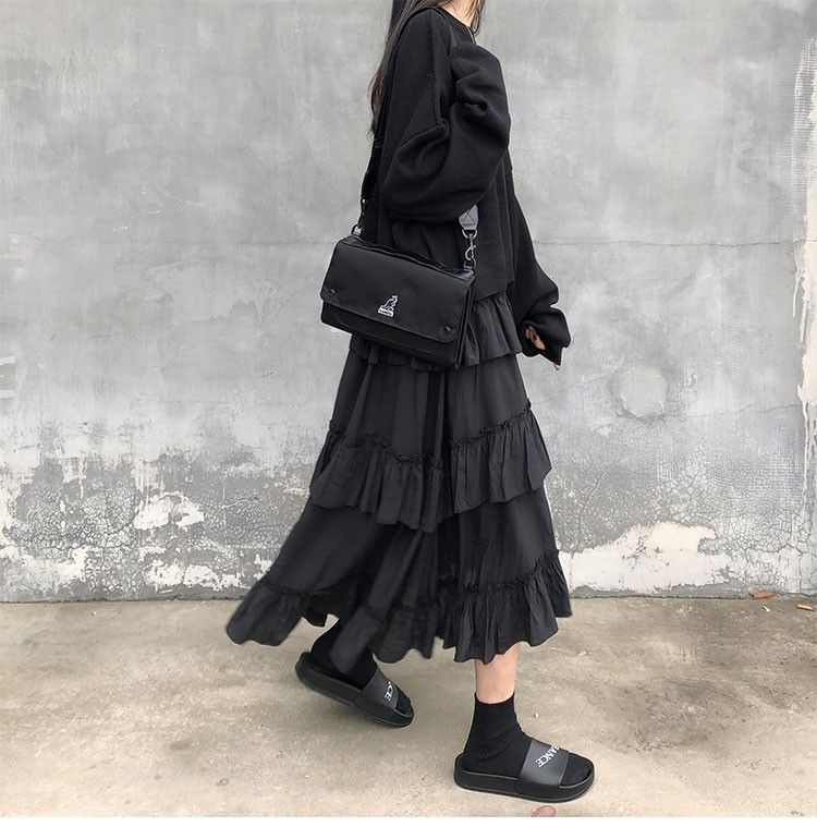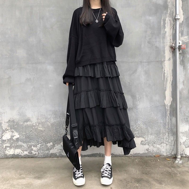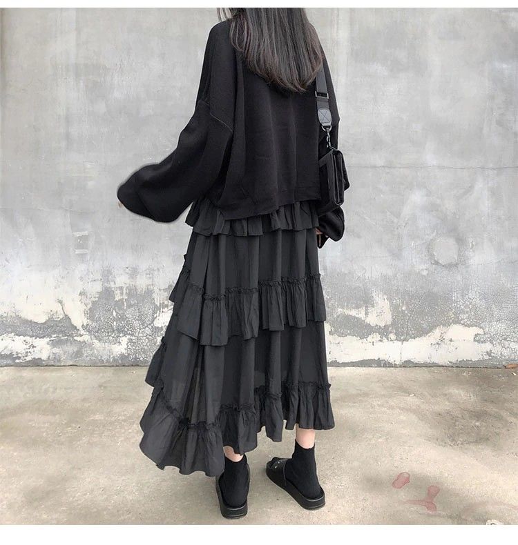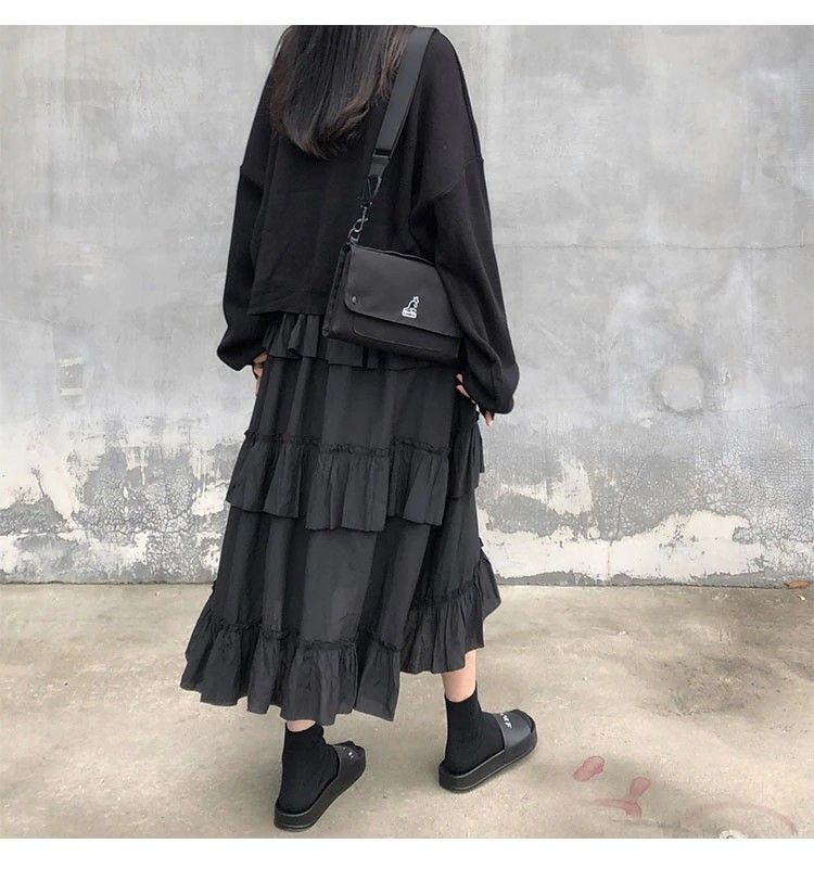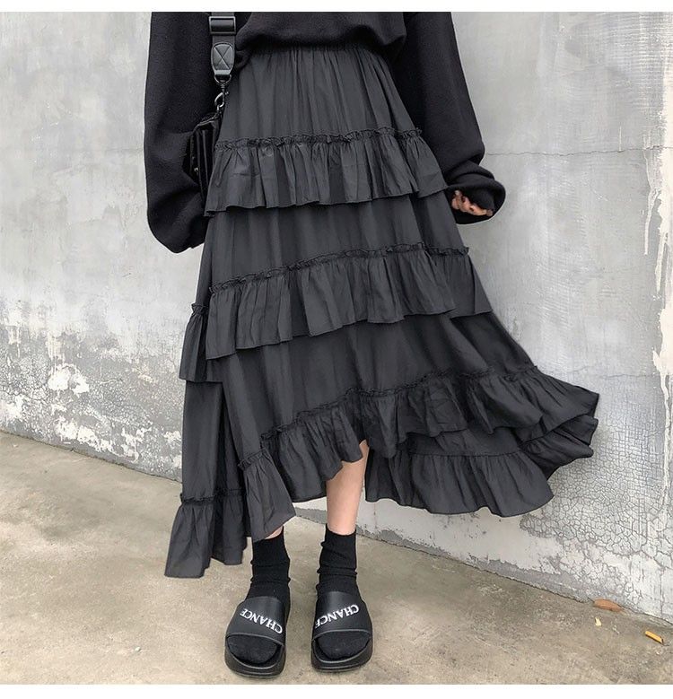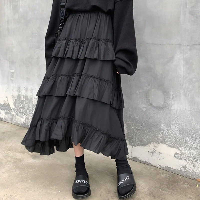 Qiukichonson ميدي التنانير الطويلة للمرأة ماكسي تنورة القوطي لوليتا الصيف عالية الخصر غير المتكافئة عالية منخفضة كشكش التنانير Rok