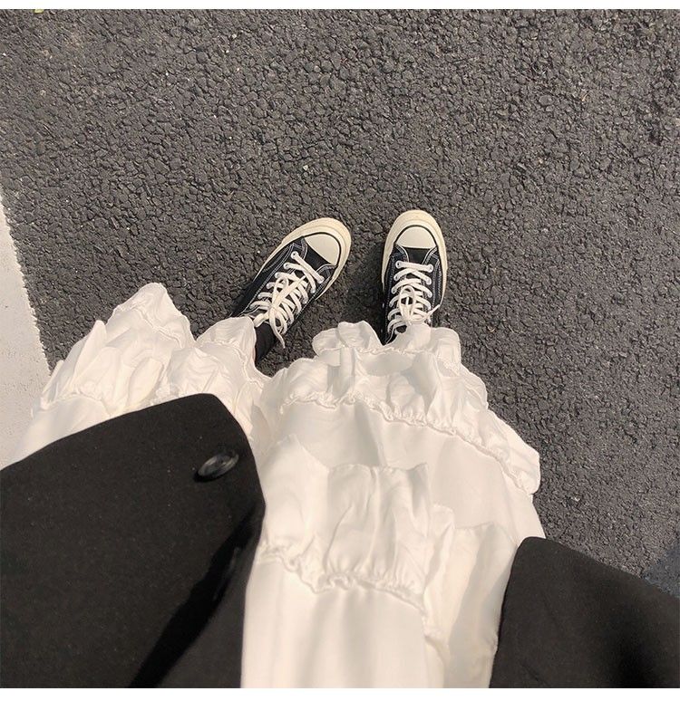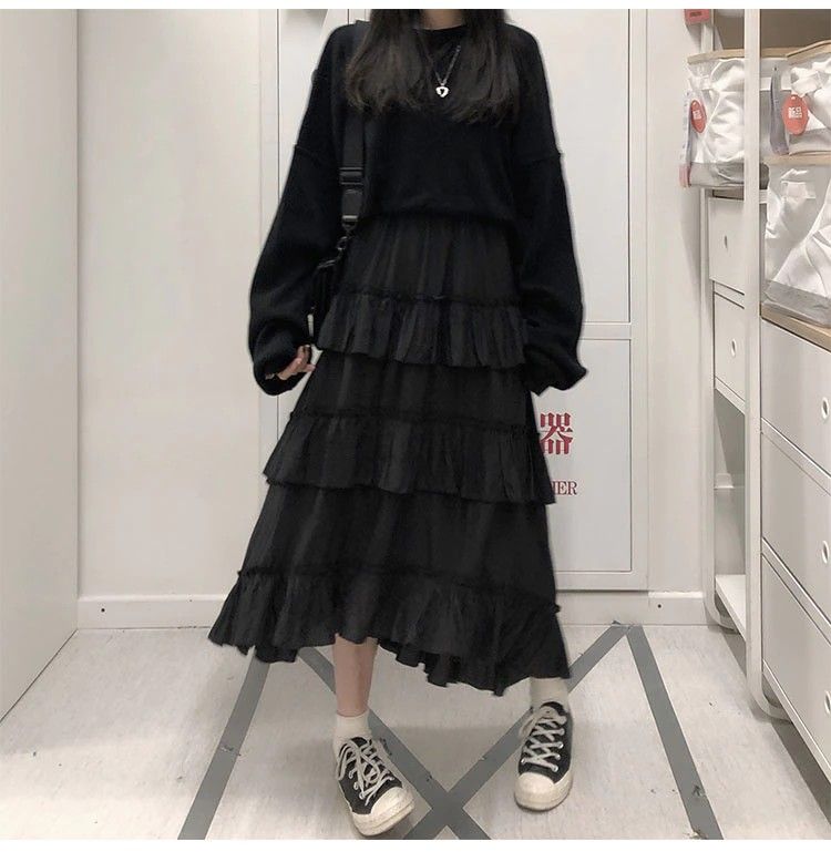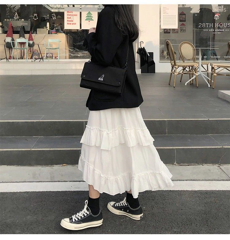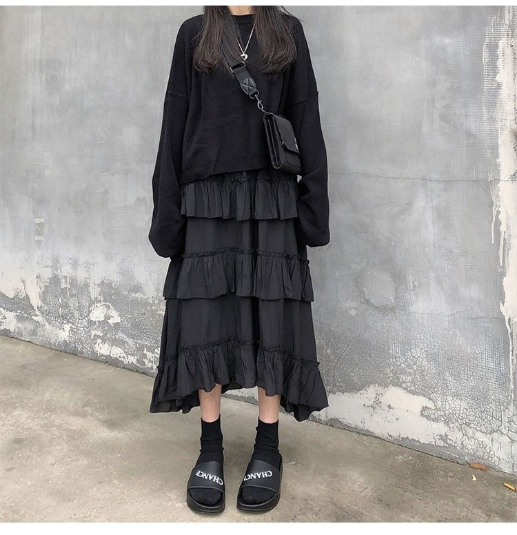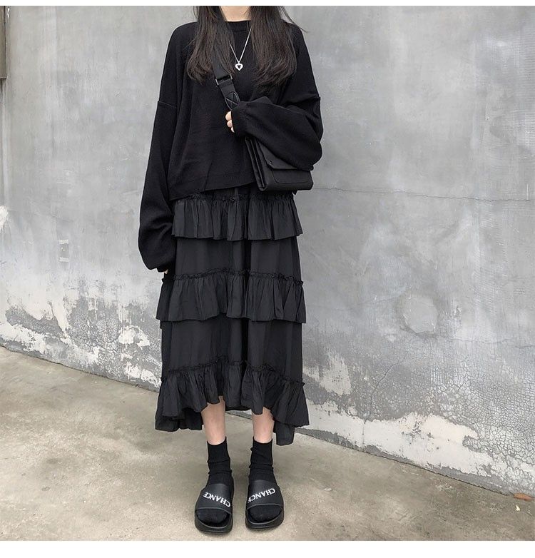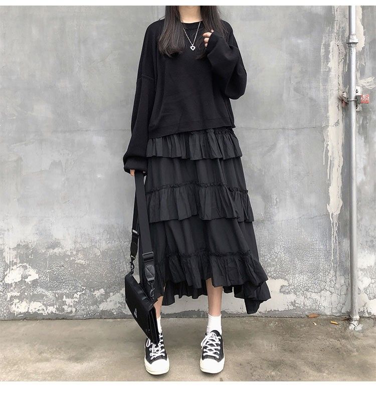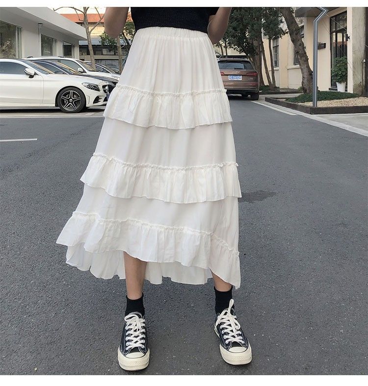 Qiukichonson ميدي التنانير الطويلة للمرأة ماكسي تنورة القوطي لوليتا الصيف عالية الخصر غير المتكافئة عالية منخفضة كشكش التنانير Rok