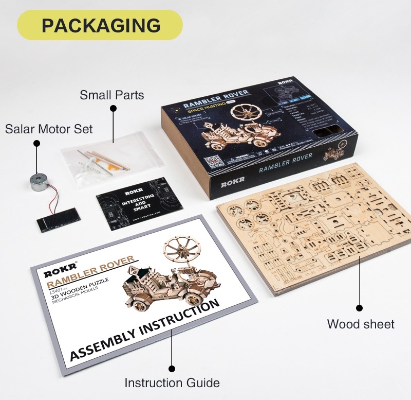 تعليمات إنجليزية + 7 ألواح خشبية مسبقة القطع + بطارية شمسية 1.5 فولت + محرك شمسي + عصا خشب