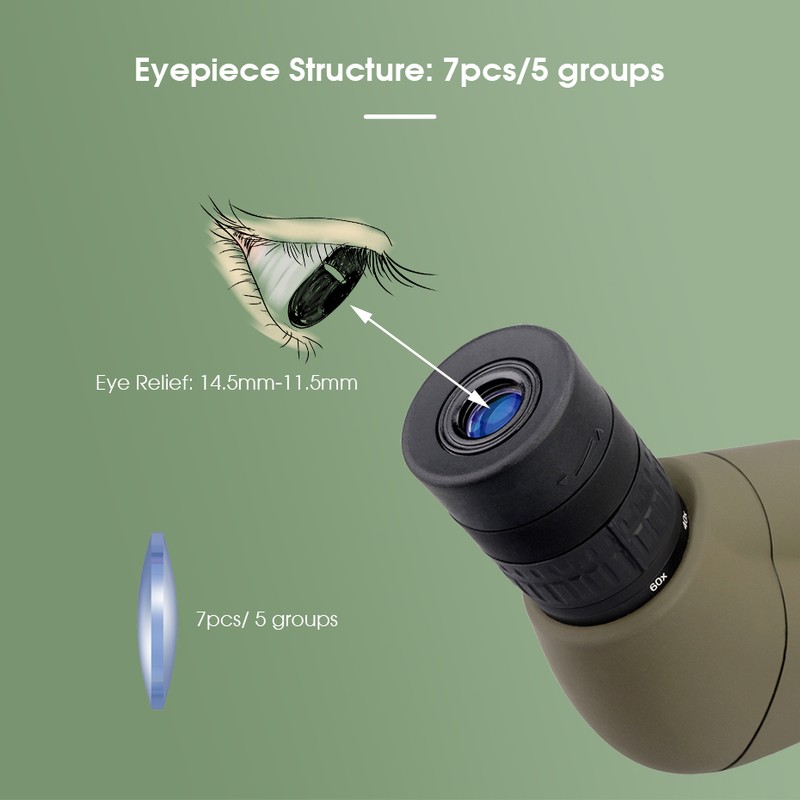 توفر لك العدسة (7 عناصر في 5 مجموعات) الدقة الفائقة والوضوح. سوف تستمتع بتجربة مراقبة مريحة بين تخفيف العين: 14.5 مللي متر-11.5 مللي متر.