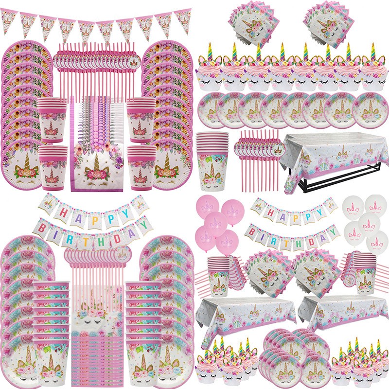 يونيكورن لوازم الحفلات لوازم الطاولة/المائدة قابل للتصرف مجموعة الاطفال حفلة عيد ميلاد الديكور Unicornio ديكور لوحات كأس راية استحمام الطفل