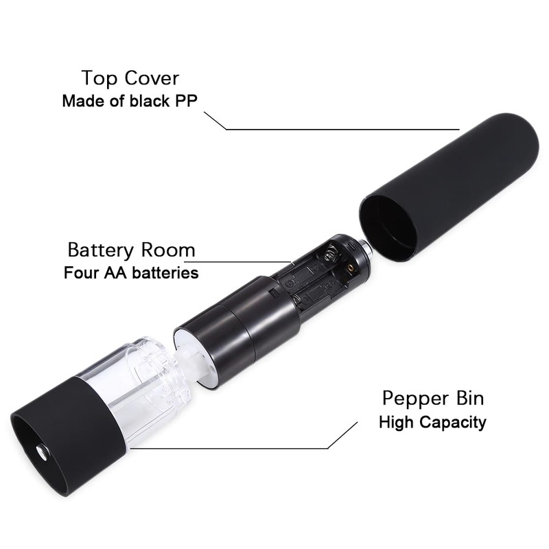 Item Name : Electric Salt Pepper Grinder Mill Material: The pepper grinder is made of stainless steel and ABS plastic, rust proof and corrosion resistant, will not affect the flavor of the spices ground Size: 22.5*5.2*5.2 cm/20.8cm*5.2*5.2cm Net Weight: 210g/240g Battery: Old Version need 4 AA batteries and Upgraded version need 6 (not included in the package) Application: The grinders can be used with Salt, Mineral salt, Himalayan salt, Pepper, Peppercorns, Black Pepper, Rice, wheat, etc Suitable Scene : The grinder is suitable for use in family kitchens, restaurant back kitchens, picnics, barbecues, etc. We provide three options : ▲pepper grinder * 1 ▲pepper grinder * 2 ▲pepper grinder * 2 + Base *1