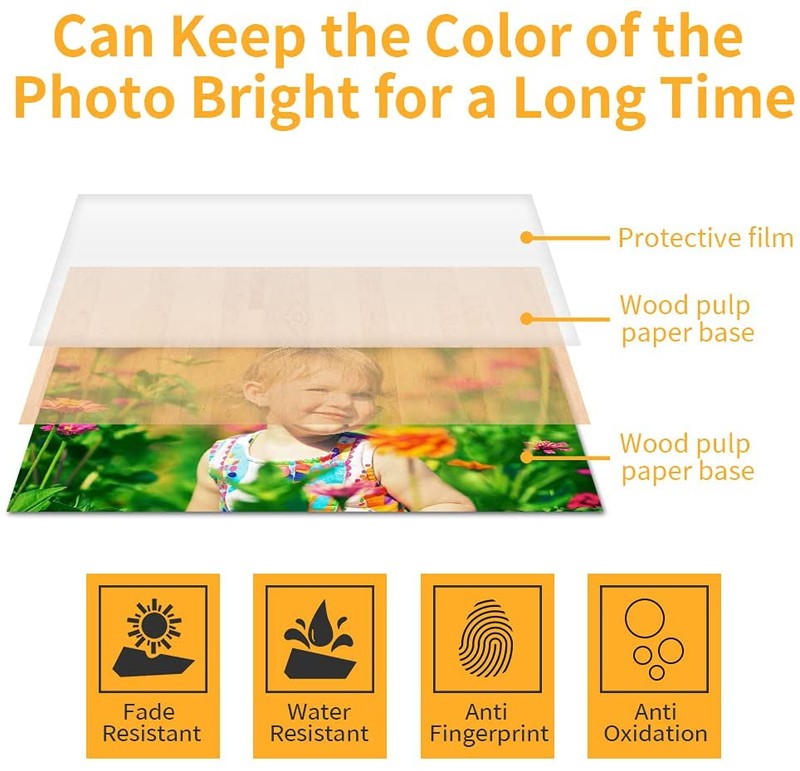 Dye sublimation technology for instant dry, Smudge-free, Water resistant, Anti-fingerprint, Anti-oxidation. Photo will be covered Automatic by Protective film after print, So you can keep it for a long time. It can print High gloss and Colorful photo, Best for you to keep your good memories