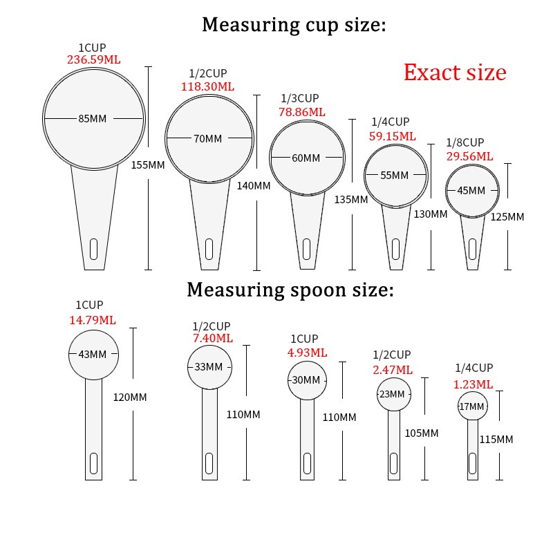 Löffel kapazität: 1/4sp (1,23 ml), 1/2sp (2,47 ml), 1tsp (4,93 ml), 1/2tbsp (7,40 ml), 1 esslöffel (14,79 ml)
