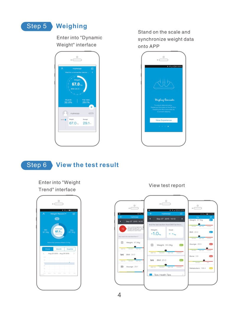 Sie ändern gerätDrücken sie die taste auf der rückseite der körper fett skala und die einheit wird ändern von kg zu pound. Setzen die gewicht waagen auf einem harten boden, bitte verwenden sie es nicht auf eine teppich. | Download die appSuche für OKOK APP in die Apple Store oder Google App, download und installieren es. | Schalten sie Bluetooth und GPSDrehen auf telefon Bluetooth und GPS, verbinden mit körper fett skala | Stehend auf die körper fett skalaBarfuß steht auf die körper fett skala, der mitte punkt ist die herkunft, die füße natürlich stehen separat auf die skala, wenn die anzahl nicht schlagen, es ist fertig. |