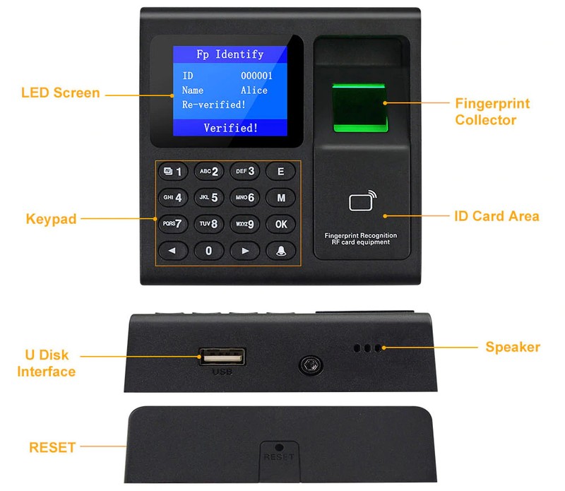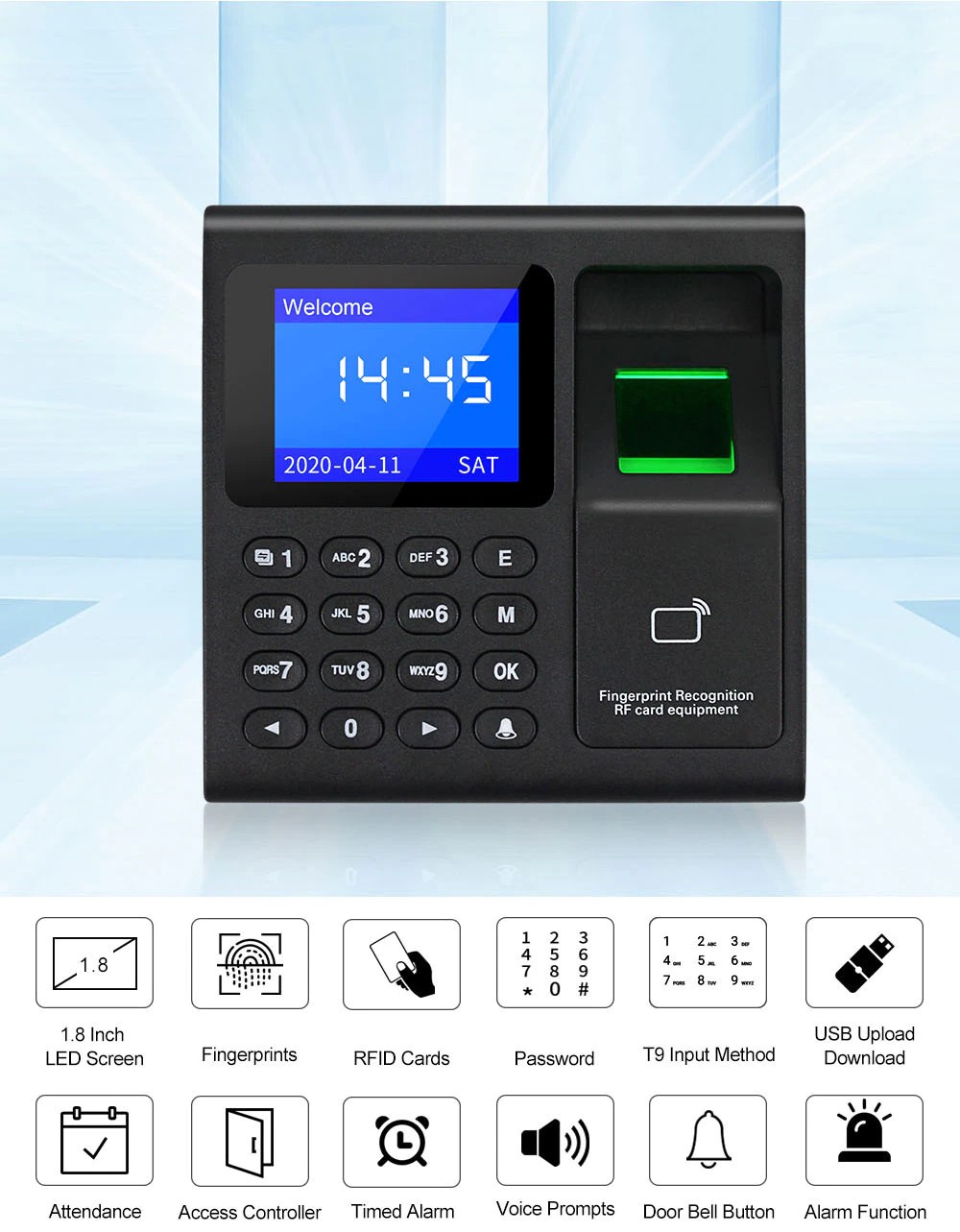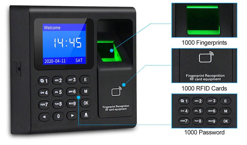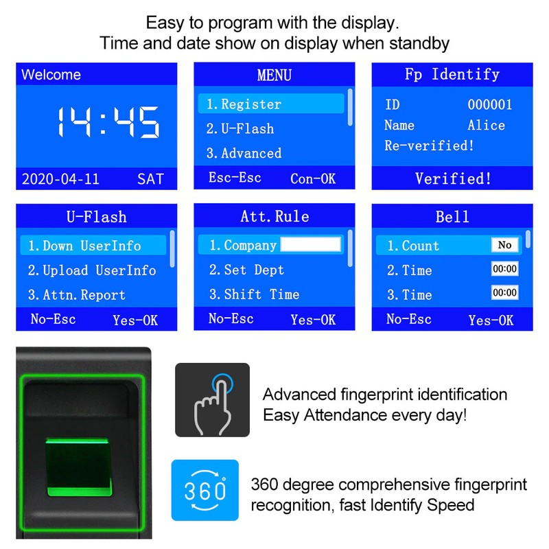 Mit diesem fingerprint zeit recorder, können sie haben ihre mitarbeiter überprüfen in durch bedeutet von fingerprint, RFID karte und passwort. Unterstützung 1000 Benutzer kapazität, 1000 fingerabdrücke, 1000 passwort, 1000 stücke RFID karten, 100000 zeit teilnahme rekord kapazität.