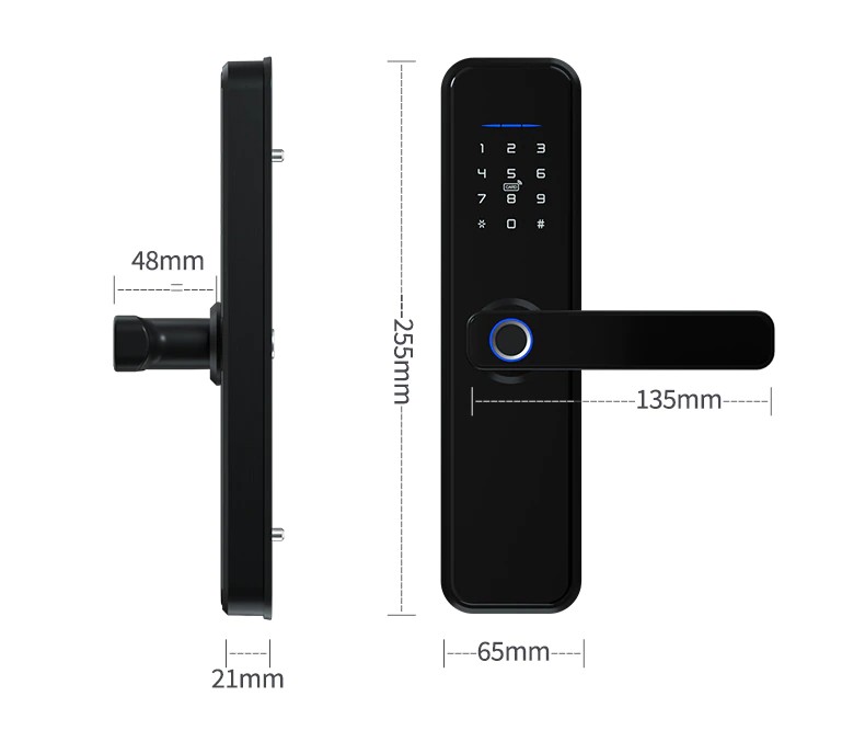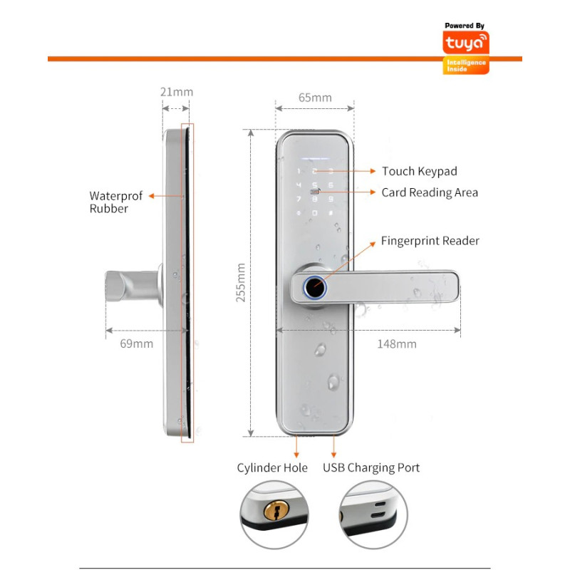 X5-the neueste verbesserte tuya fingerprint lock von 2021, Im Vergleich zu 520 modell, in auftrag zu erfüllen unsere markt anforderungen, wir haben das geändert schloss größen von 240*60mm zu 255*65mm, und 4 stücke AAA batterien ladung zu 4 stücke AA, die batterien leben können werden dauerte für mehr als 6 monate. Neben, wir hinzugefügt wasserdichte gummi zu verbessern die safty und haltbarkeit.