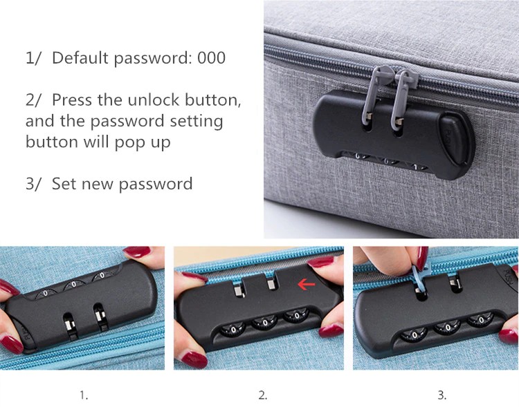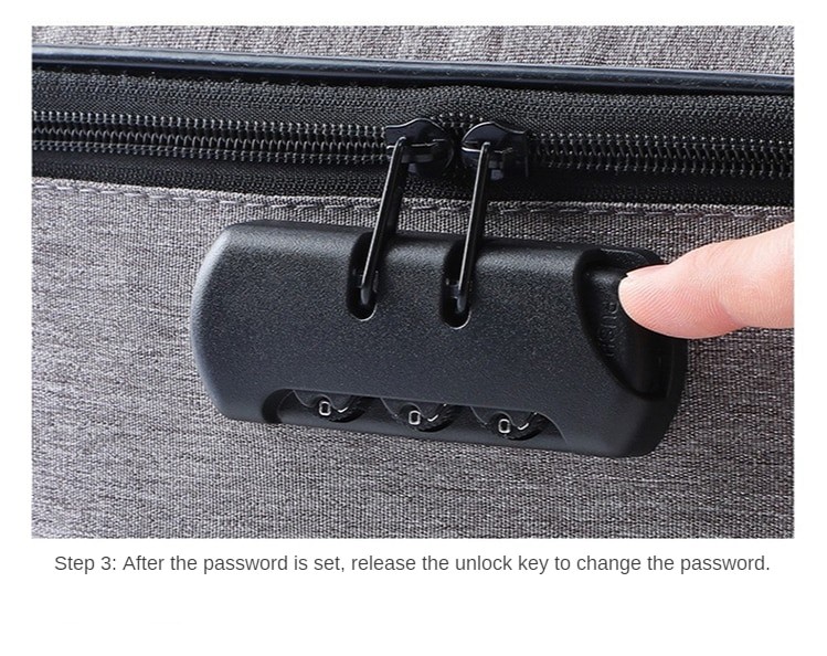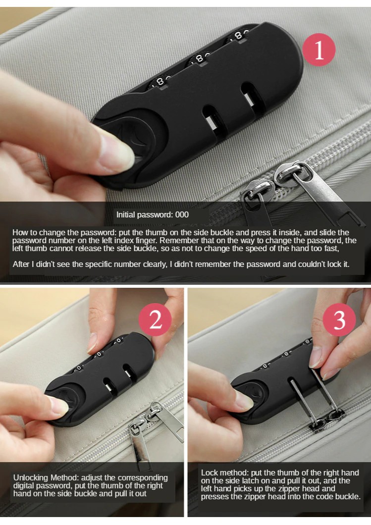 4. Locking methode: Drücken Sie die taste auf der rechten hand und ziehen es heraus. Die links hand picks up die zipper kopf und schnallen es zu die code lock. Dann release die schlüssel und die zipper kopf wird nicht, was darauf hinweist, dass die sperre wurde erfolgreich abgeschlossen