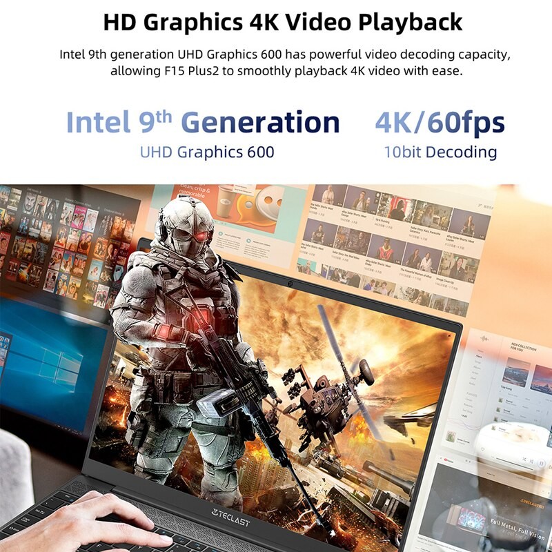 Intel 9th generation UHD Grafiken 600 hat leistungsstarke video dekodierung kapazität, so dass F15 Plus2 um reibungslos zu wiedergabe 4K video mit leichtigkeit.