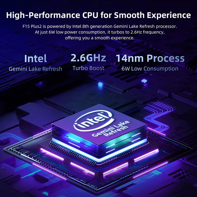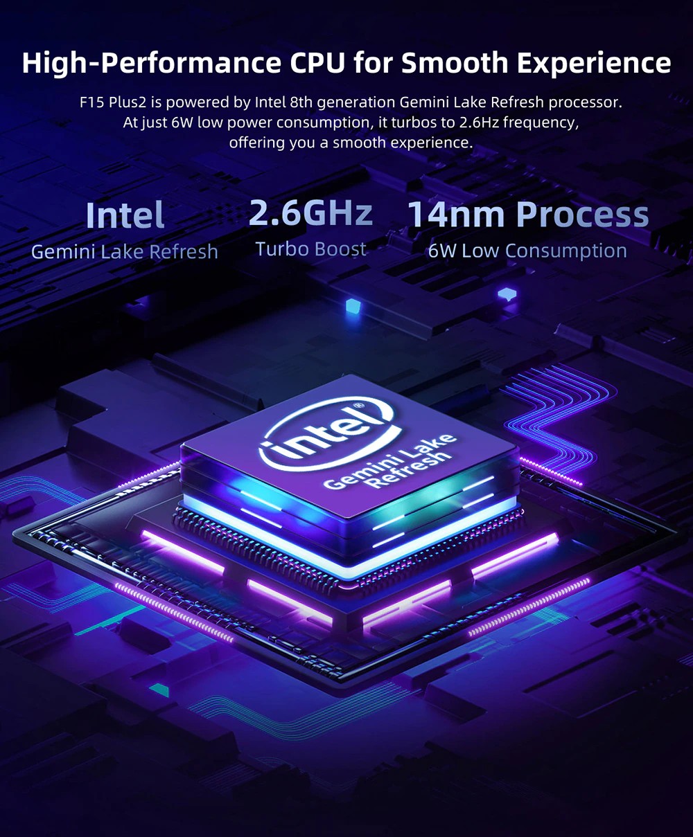 F15 Plus2 ist angetrieben durch Intel 8th generation Gemini See Aktualisieren prozessor. Bei nur 6W niedrigen power verbrauch, es turbos zu 2,6Hz frequenz, bietet sie eine glatte erfahrung.