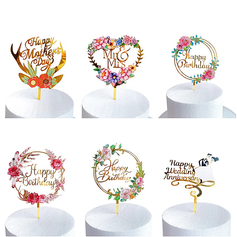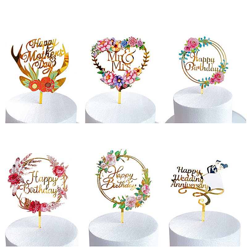 Blumen Kuchen Topper Glücklich Geburtstag Gold Silber Geburtstag Party Kuchen Einfügen Acryl Dekoration Hochzeit Kuchen Dessert Decor