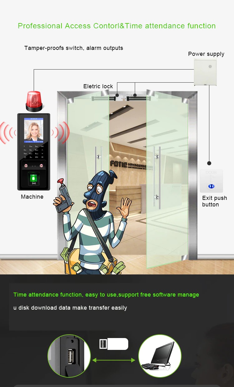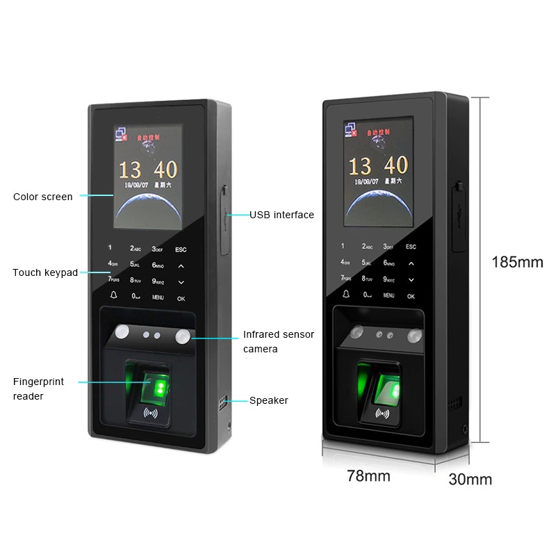 Die NX7 eigenschaften die schnellsten handels-basierte fingerabdruck-matching-algorithmus und hohe-bild qualität infrarot erkennung fingerprint sensor. Das gerät bietet flexibilität, INSTALLIERT werden eigenständig oder mit dritten party zugangskontrolle panels'. , Dass unterstützung standard Wiegand signal. Alle operationen können durchgeführt werden auf die TFT-LCD farbe bildschirm. Die fingerprint und gesicht bild wird angezeigt auf es. , Dass wird guide benutzer zu setzen finger auf richtige position und erhöhen anerkennung rate. TCP/IP und U disk sind verfügbar, dass das gerät kann verwendet werden in verschiedenen netzwerk