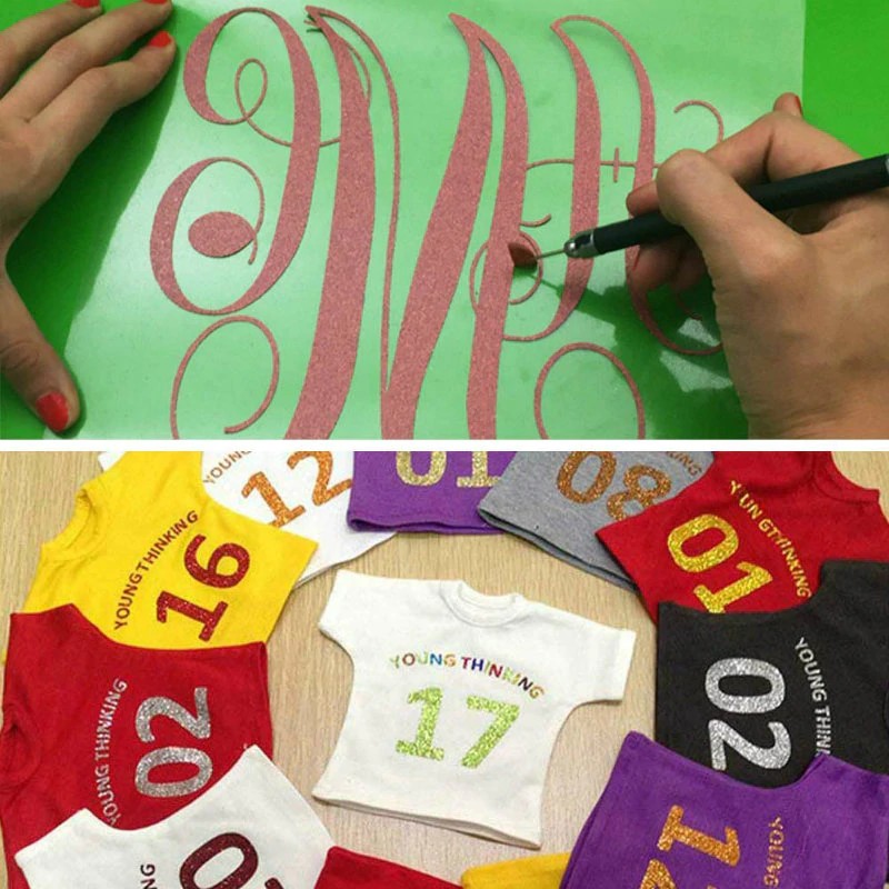 Vinyl transfer ist jetzt die beliebteste wärme presse material. Vinyl kann geschnitten werden durch eine vinyl cutter zu drucken name, nummer, logo und design auf T-shirts,sport tragen und andere kleidungsstücke durch eine wärme drücken. Es ist sehr langlebig, dehnbar, wäscht schnelle und dauern wird leben von bekleidung. prozess die bild auf ihrem computer, cut die bild kontur mit cutter plotter, dann ziehen sie die teil sie nicht benötigen. Endlich, drücken sie die bild auf T-shirt oder andere stoff produkte.