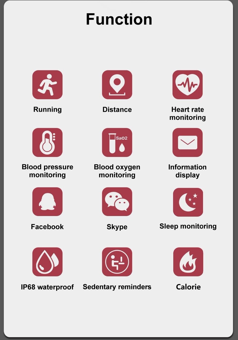 * Hauptmerkmale: sitzende erinnerung, multi-sport modus, volle schrift push, WeChat kampagne, wetter prognose, ablehnen call, durch gerät, alarm erinnerung, foto, trinken erinnerung, gesture control, nicht stören modus, erinnerung modus, schlaf überwachung, G- sensor