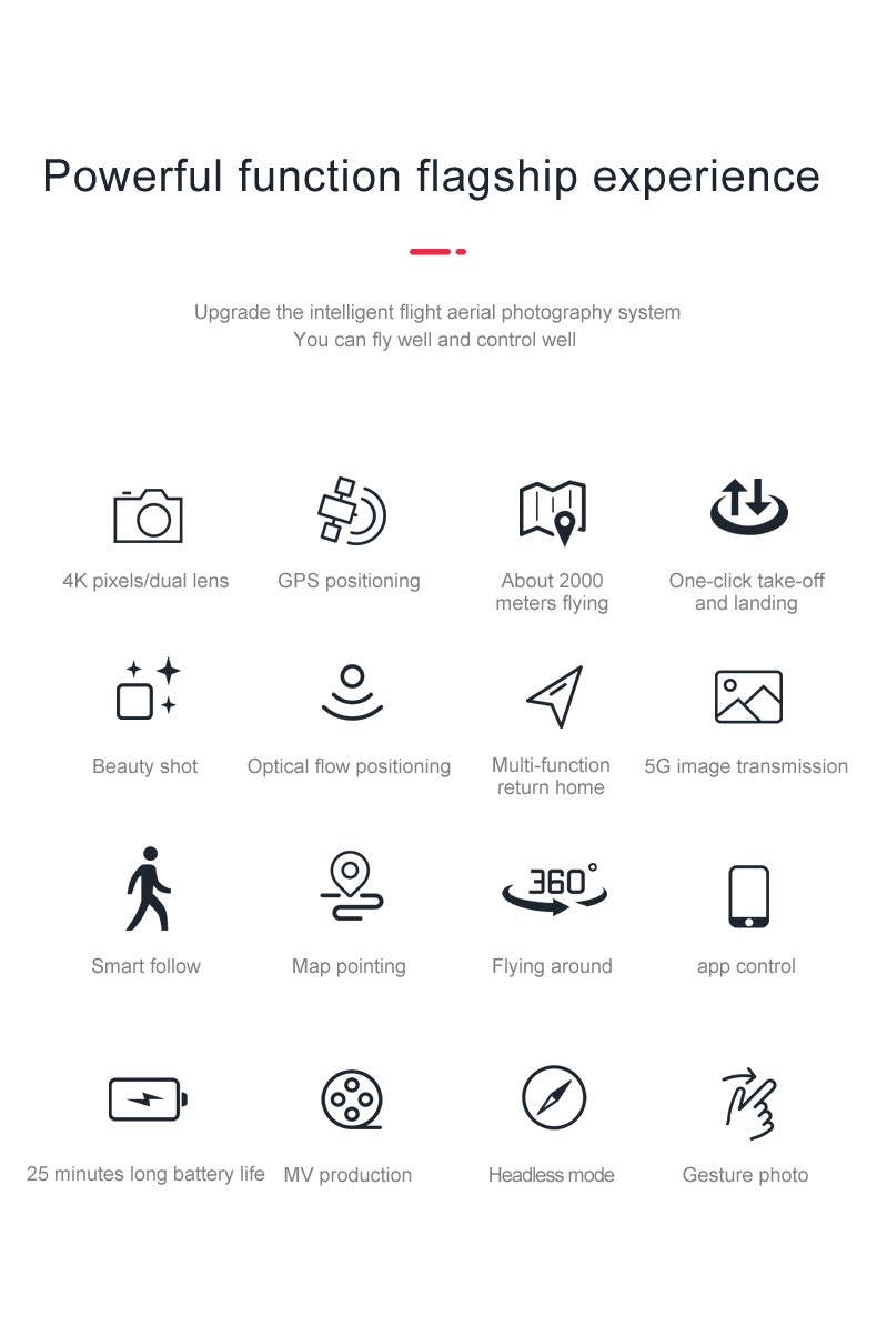 Oben/Unten, Vorwärts/Rückwärts, Links/Rechts, Seitlichen Flug, Ebene 3 Flug Geschwindigkeit, LED Licht, Folgen Sie Mir, Flug Um, Wegpunkt Flug, Höhe Halten Modus, Headless Modus, eine-return-taste, ein-taste nehmen-off/landung, WiFi FPV, kamera/video
