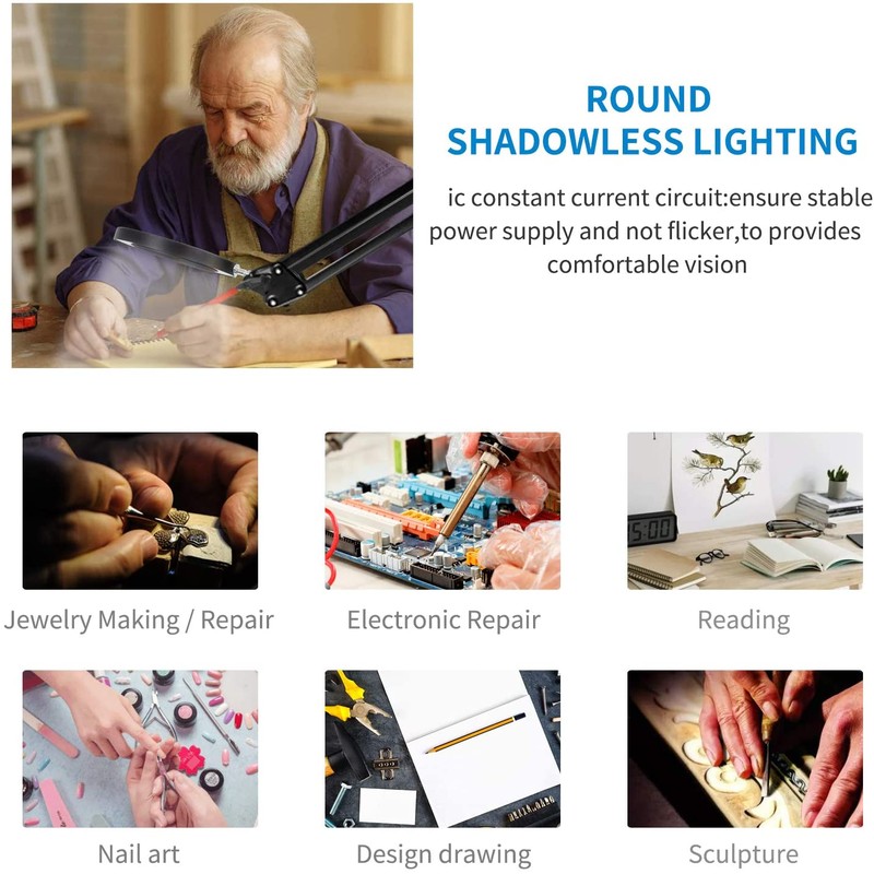 Mit licht-qualität solide high-durchlässigkeit glas: diese lampe ist ausgestattet mit einem 4,2-zoll echt glas objektiv, eine positive dioptrien glas mit eine vergrößerung von 10 mal, klar und ohne optische verzerrung. Lange-term verwendung von high-qualität linsen wird nicht machen sie fühlen sich dizzy oder unangenehm. Sehr geeignet für kreuz stich, nähen, malerei, lesen, arbeit, wartung, kreuz stich, schweißen, etc.