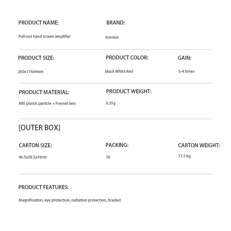 Die telefon bildschirm verstärker verfügt in seiner pull-typ struktur, die kann effektiv schützen den bildschirm, wenn es ist nicht verwendet, einfach zu bedienen und tragbar. Neben, die hohe klar acryl bildschirm ist eye-schutz.