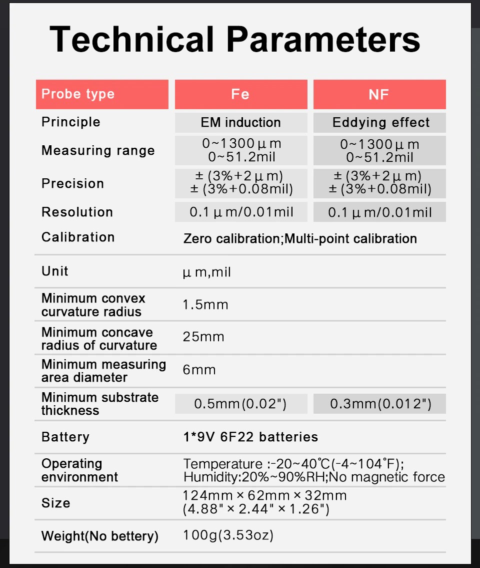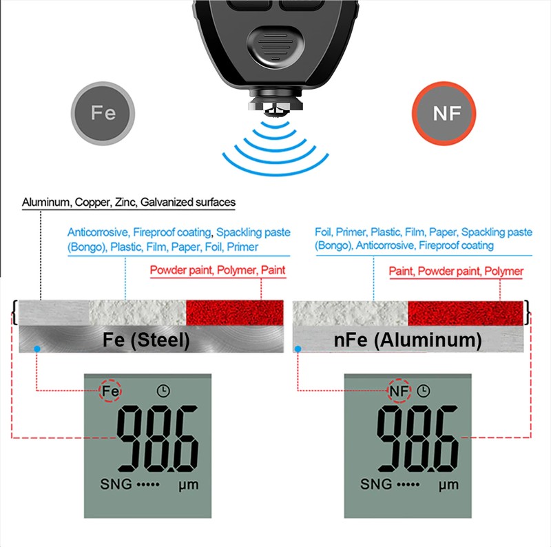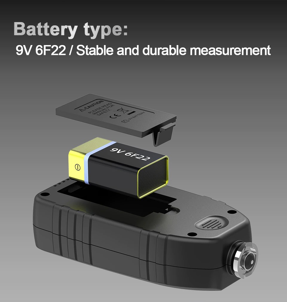 Die dicke gauge ist verwendet zu messen die dicke der überzogene und beschichtet blatt auf metall, zb farbe/emaille/chrome auf stahl, farbe und eloxieren beschichtung auf aluminium/kupfer. Die gauge dauert die präzision integrierte sonde, und verwendet prinzipien von electro-magnetische induktion und die wirbelstrom wirkung, die automatisch erkennt die attribut von substraten.