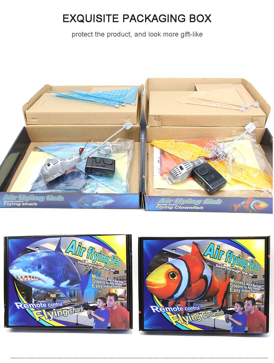 Dieser ferngesteuerte fliegende Hai oder Clownfisch fliegt durch den Raum und imitiert dabei die Bewegung seiner Unterwasserverwandten, indem er sich selbst mit lebensechten Flossen antreibt. Eine Fernbedienung steuert die Luftbewohner, die sich in verschiedene Richtungen bewegen, während sie Hindernissen wie Treppenhäusern ausweichen. Dies ist perfekt für drinnen und für zu Hause Partys. Dies wird auch ein tolles Geschenk sein!